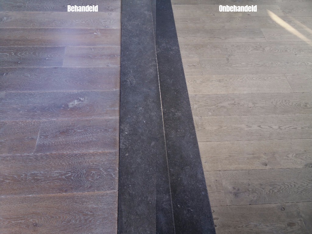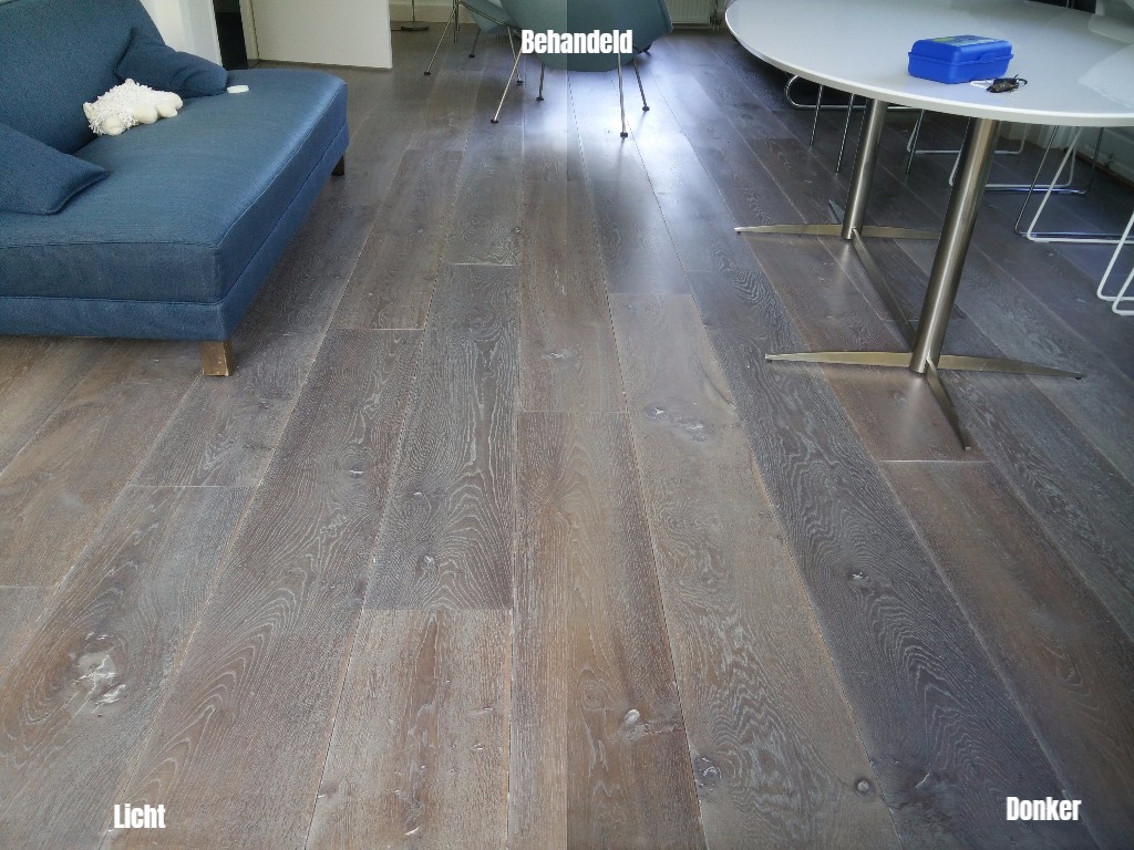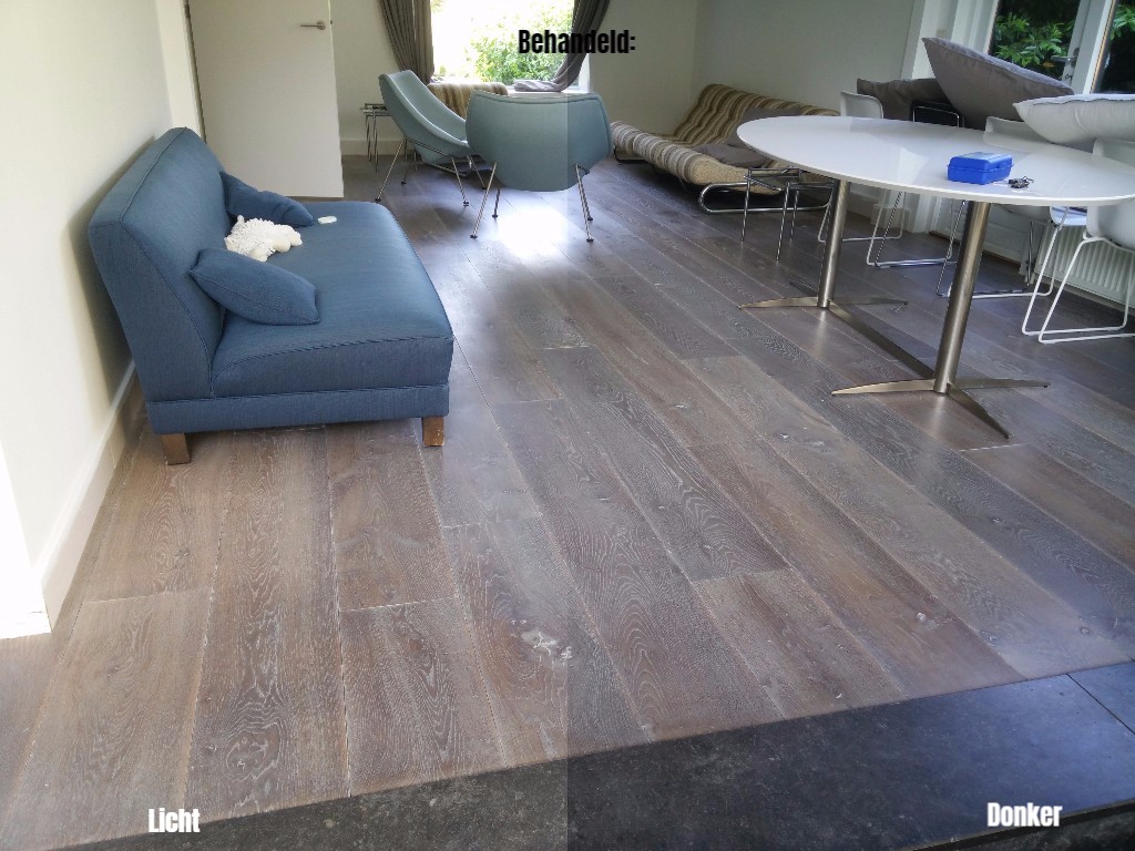 Hier ziet u links de behandelde en rechts de onbehandelde eiken vloer: